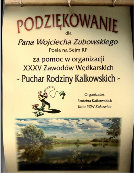 Wczoraj otrzymałem podziekowania za pomoc w organizacji XXXV Zawodów Wędkarskich o Puchar Rodziny Kalkowskich.