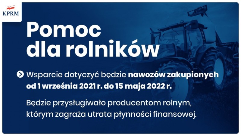 Producenci rolni, którym zagraża utrata płynności finansowej, otrzymają wsparcie z budżetu państwa. Uwaga - pomoc będzie dotyczyć nawozów zakupionych między 1 września 2021 r. a 15 maja 2022 r. Dofinansowaniem może zostać objęte 50 ha – 500 zł za 1 ha upraw rolnych i 250 zł za 1 ha łąk, pastwisk i traw na gruntach ornych.