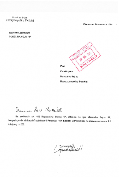 Poseł Wojciech Zubowski złożył dziś w Sejmie interpelację poselską do wicepremier Elżbiety Bieńkowskiej w sprawie remontu linii kolejowej nr 289. Pytania w niej zawarte dotyczą opóźnień tej inwestycji.