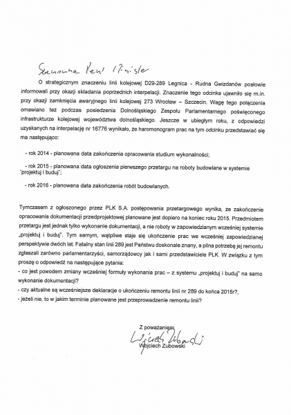 Jeszcze w ubiegłym roku przedstawiciele strony rządowej, udzielając odpowiedzi na interpelację posła Wojciecha Zubowskiego, informowali, że planowane zakończenie remontu linii 289 Legnica – Rudna Gwizdanów to koniec roku 2016. W roku 2015 miał zostać ogłoszony przetarg w formule „Projektuj i buduj”, pozwalający mieć nadzieję, że zgodnie z założeniami do końca roku 2016 nastąpi ukończenie robót. Niestety, mimo zapewnień ze strony Ministerstwa, remont tej ważnej dla naszego regionu linii kolejowej we wspomnianym terminie jest już mało realny. Wskazuje na to fakt ogłoszenia przetargu na wykonanie samej dokumentacji projektowej, nie ma natomiast mowy o pracach remontowych! Dla nich konieczne będzie ogłoszenie kolejnego przetargu, w na razie nie ustalonym terminie.
