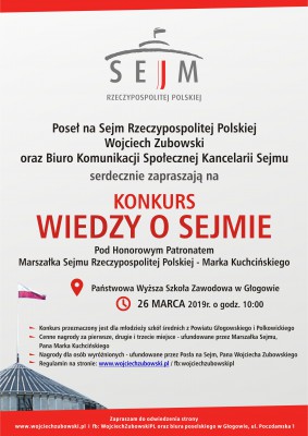 Wraz z Biurem Komunikacji Społecznej Kancelarii Sejmu gorąco zachęcam uczniów szkół średnich powiatu głogowskiego i polkowickiego do wzięcia udziału w konkursie z wiedzy o Sejmie. Jego istotą i przesłaniem jest propagowanie i pogłębianie wiedzy wśród młodzieży szkolnej na temat Sejmu, jego organów, funkcji oraz procesu legislacyjnego. Na zwycięzców czekają cenne nagrody.