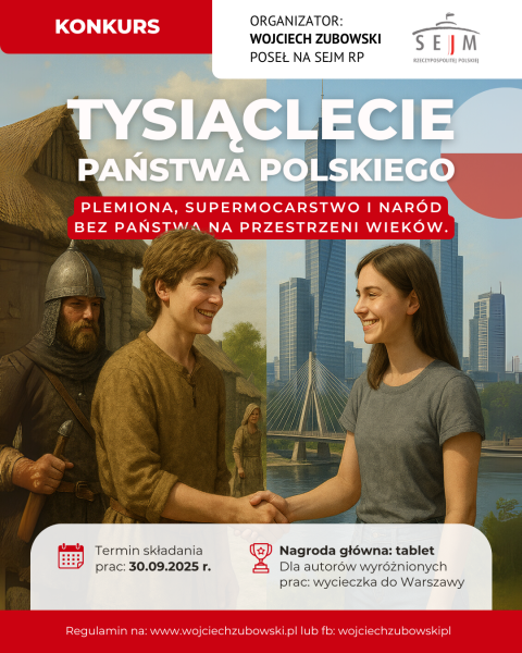 W tym roku z okazji tysięcznej rocznicy Koronacji Bolesława Chrobrego zapraszam młodzież szkół ponadpodstawowych powiatu głogowskiego, legnickiego oraz polkowickiego do głębszej refleksji nad dziejami naszej Ojczyzny i do próby odpowiedzi na pytanie: które wydarzenie było najważniejsze w historii Państwa Polskiego?